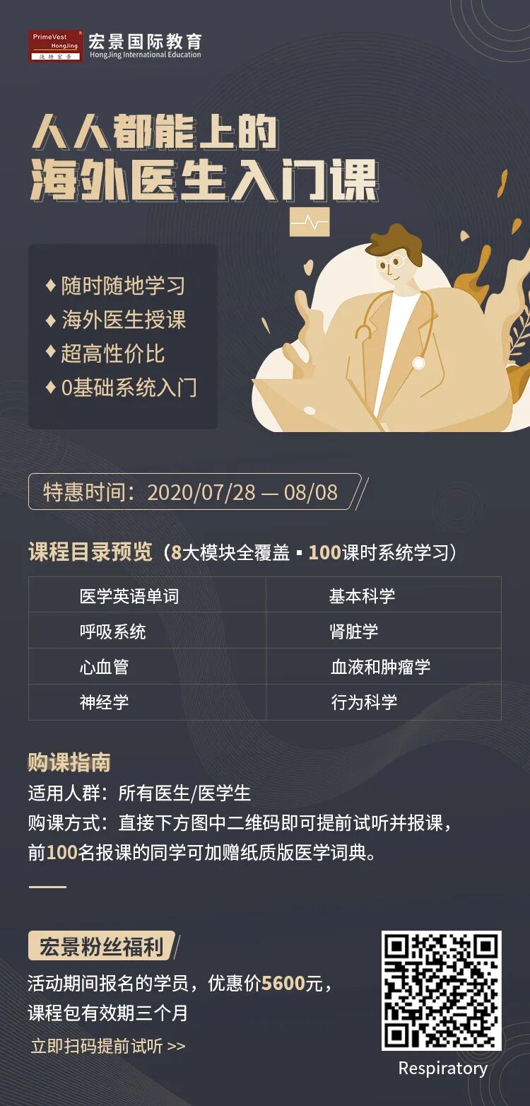 为了能够让更多医生朋友们能够更进距离,精确学好的现代医学临床知识,宏景医生部特别打造——海外医生入门课程,涵盖入门现代医学必备的专业知识和技巧,系统地为大家传授海外医疗临床知识。与市场上参差不齐和价格高昂的课程相比,此课程以其便宜的价格,带想要做一名临床技艺娴熟的你进入现代医学的殿堂。